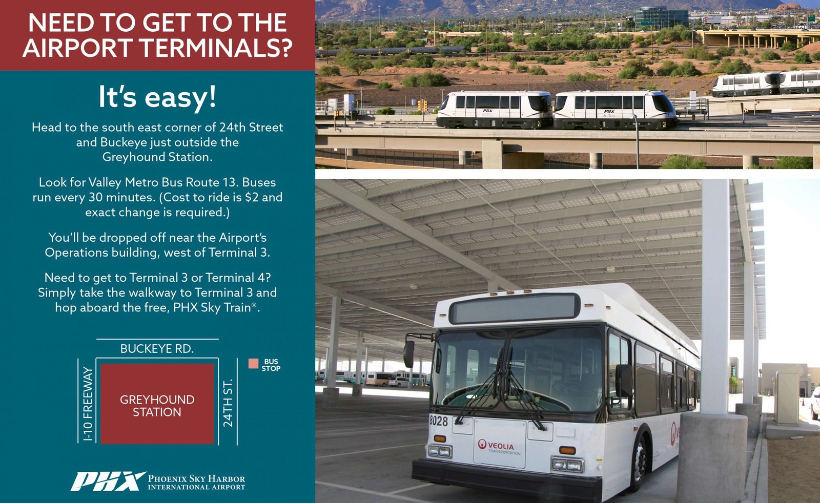- Route 13 of the Valley Metro bus system conveniently halts by the Operations building at the western end of Terminal 3 and at 24th Street close to the 24th Street PHX Sky Train® Station.
